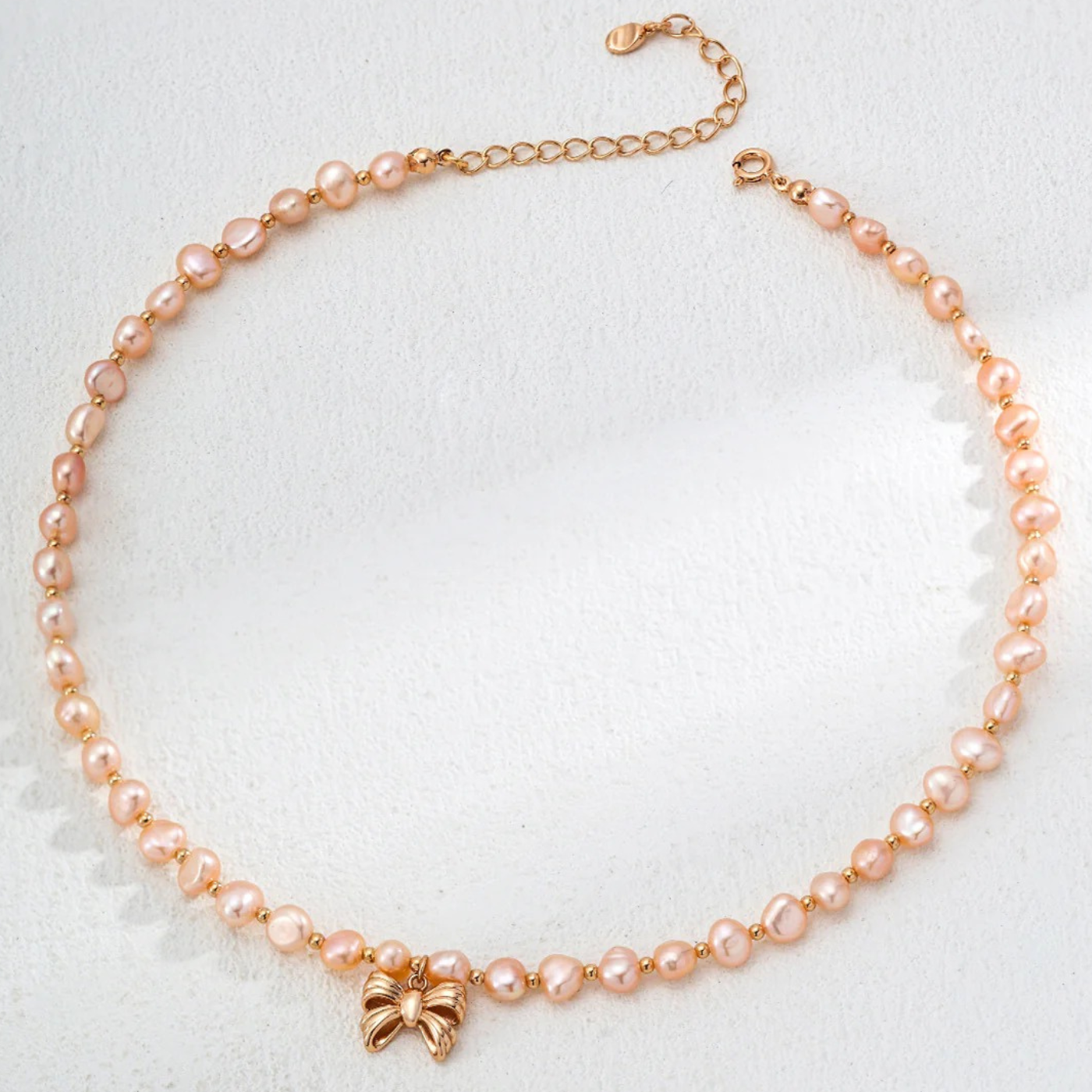 Blush Bow Freshwater Pearl Necklace – S925 Sterling Silver in Vintage Gold