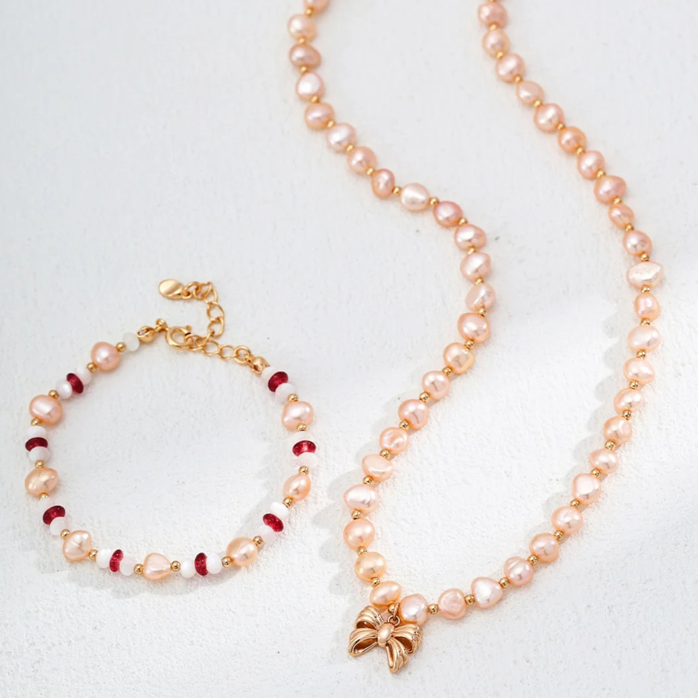 Softly nostalgic and effortlessly feminine, the Blush Bow Necklace brings a modern romantic touch to the timeless pearl strand. Hand-strung with natural blush-toned freshwater pearls, each bead glows with a gentle luster. At the center, a sculpted vintage gold bow charm adds a sweet, vintage-inspired finish.