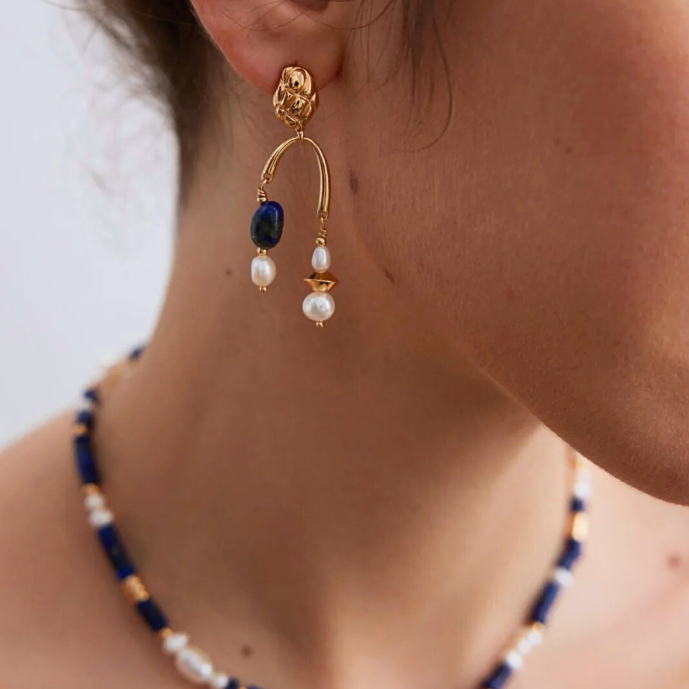 Deep blue meets soft glow. This collar-length necklace layers lapis lazuli with natural freshwater pearls and warm metal accents for a refined pop of colour.