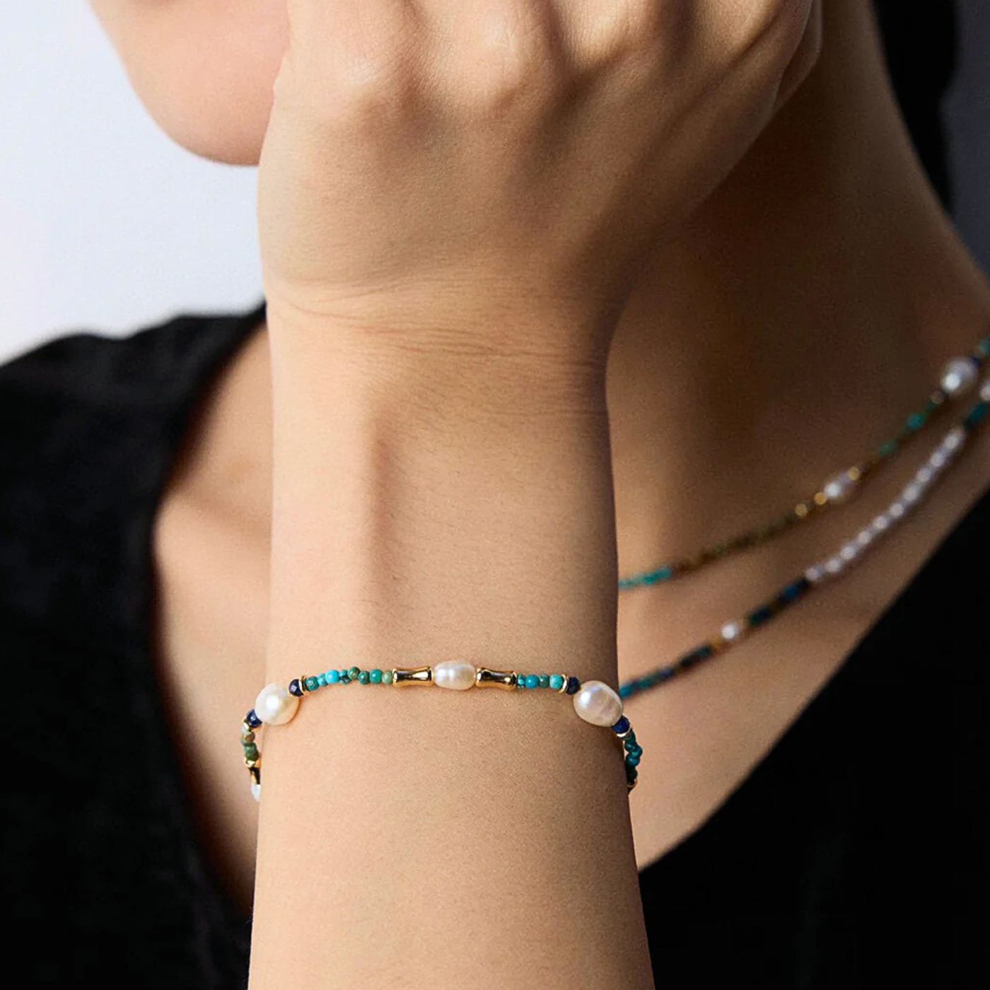 Fresh turquoise, deep lapis, and natural freshwater pearls—a modern, minimal trio. This bracelet threads petite stones with sculptural tube accents on S925 Sterling Silver, finished in either vintage gold or white-gold tone.